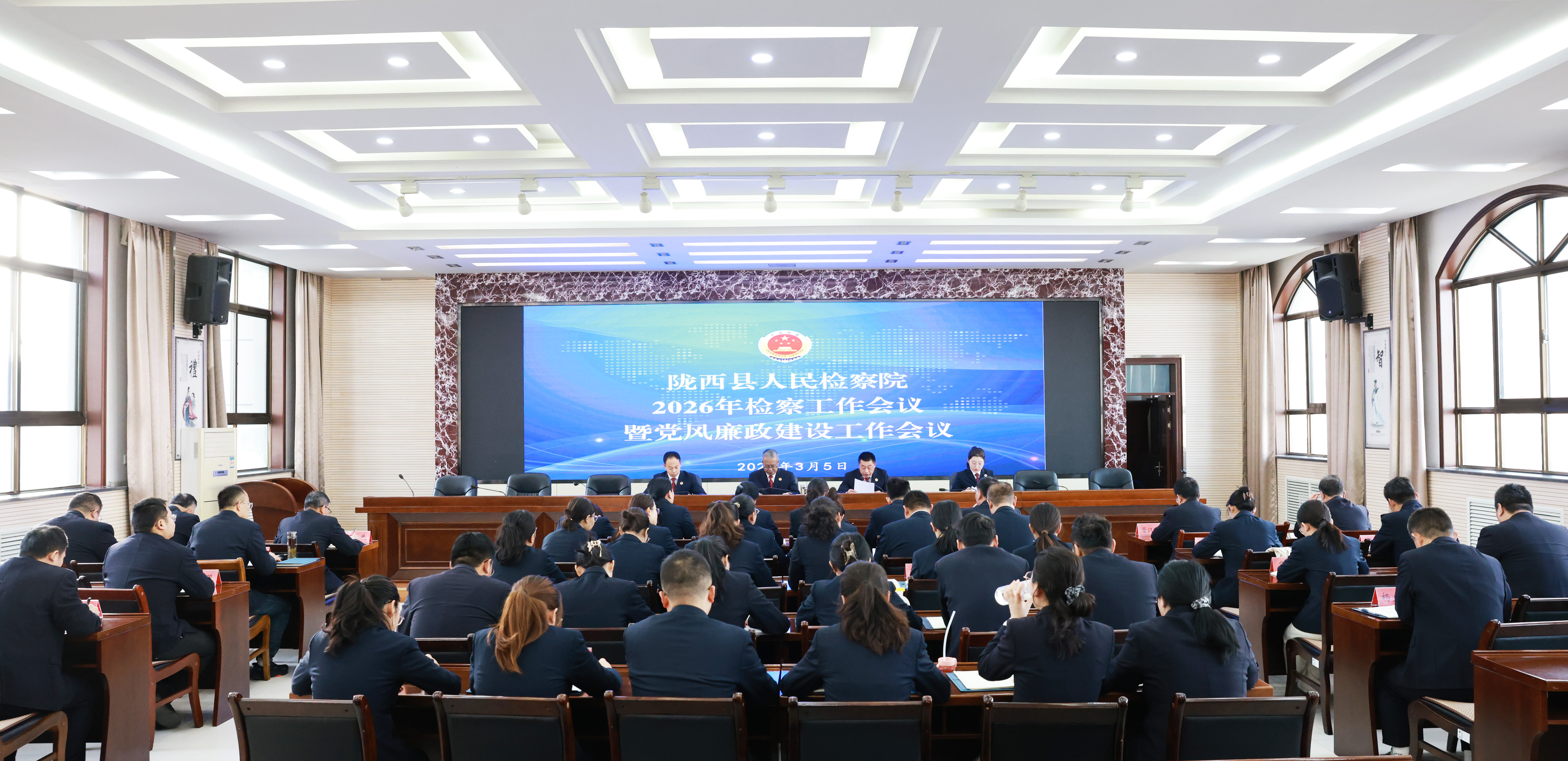3月5日,陇西县人民检察院召开2026年检察工作会议暨党风廉政建设工作会议,总结回顾2025年工作,安排部署2026年工作。院党组书记、检察长后振国出席会议并讲话,党组成员、副检察长焦怀德主持会议,全体干警参加。